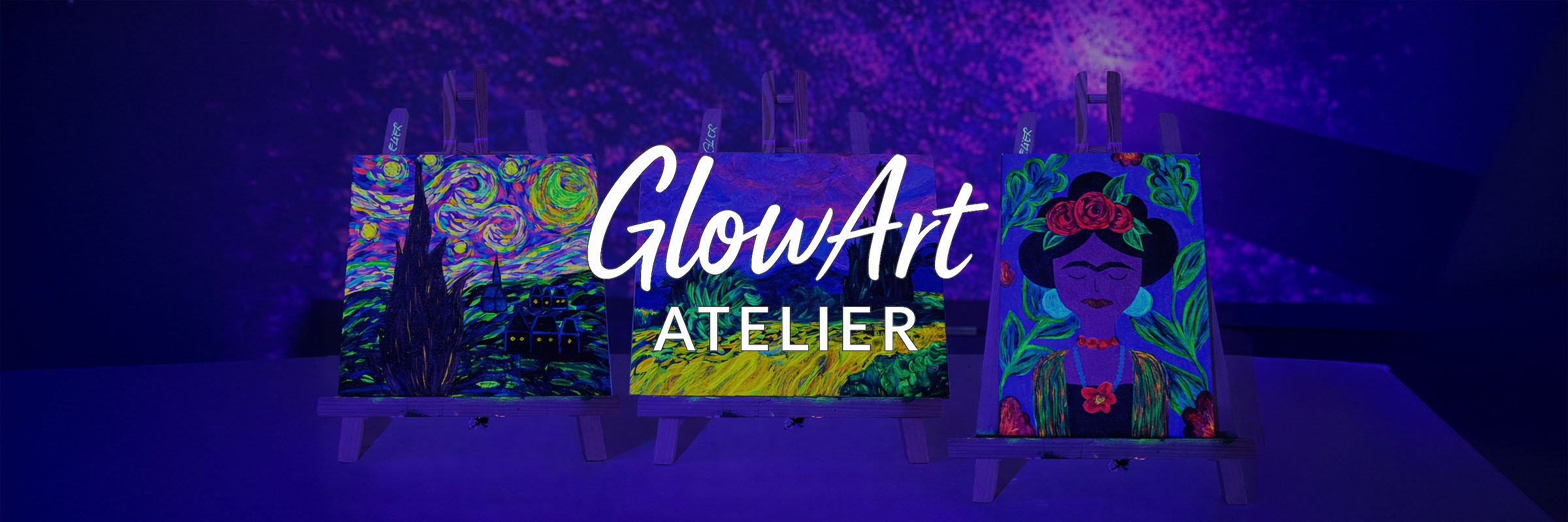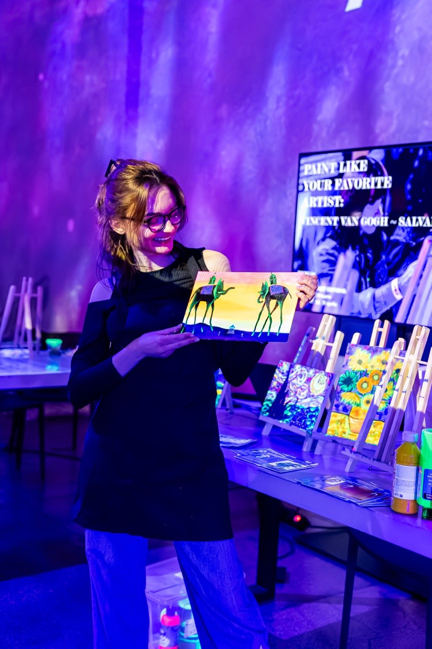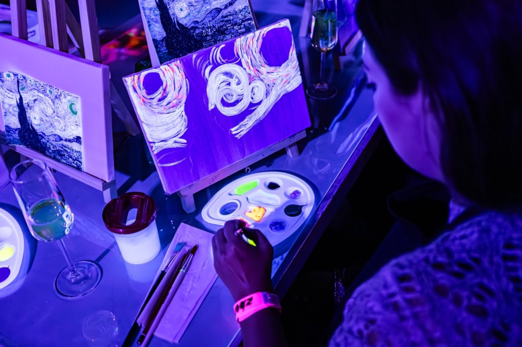🎨 Pictează, relaxează-te și lasă-ți imaginația să strălucească în întuneric! Descoperă un atelier unic unde arta prinde viață sub lumina UV. Cu pensula în mână, culorile fluorescente pe pânză și un pahar alături, vei intra în universul vizual al lui Van Gogh & Frida Kahlo și vei crea propria ta versiune, într-o atmosferă vibrantă și plină de energie.